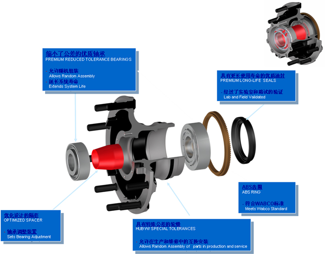 1.輪轂總成由精加工輪轂、優(yōu)質(zhì)油封、特殊公差要求的滾子軸承和獨(dú)特的的精加工軸承隔套等零件組成